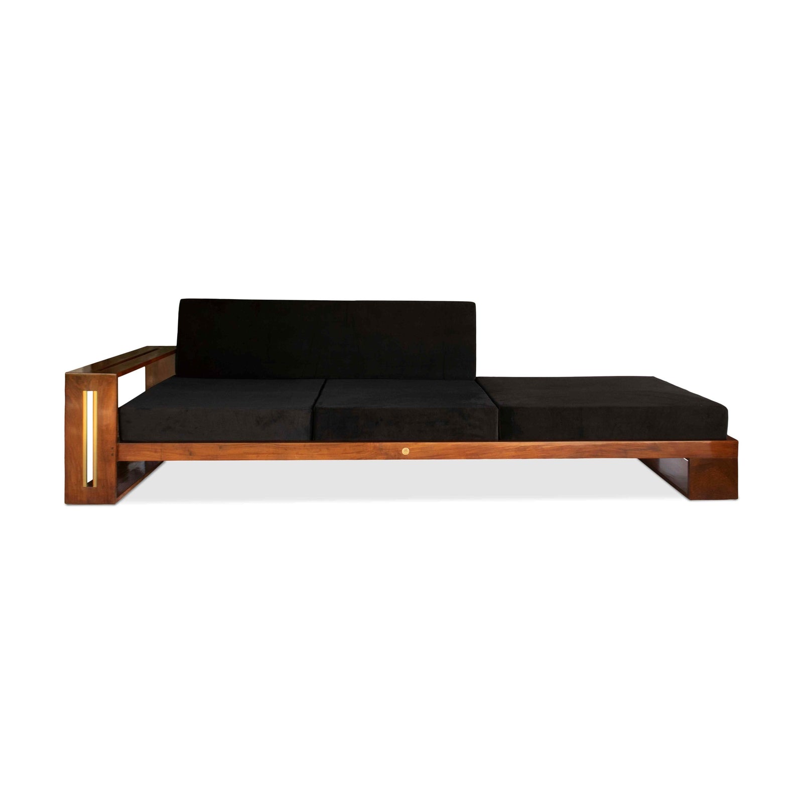 Adorned with brass trimmings and surmounted with cushions upholstered in black velvet fabric, the solid wood daybed doles out deep tones for a look that's nuanced by hints of textural inflection. Expansive and exquisite, it's a real showstopper.